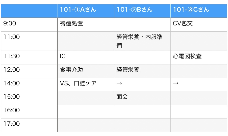 看護師の1日には毎日時間の決まっているルーティーンの仕事がありますよね。バイタル測定、清拭、配下膳、経管栄養、ミキシングなどです。そのほかに、受け持ち患者のイベント(検査、オペ、入退院、ICなど)があればそれらを軸にスケジュールを組んでいきます。ここで大切なのは、何にどのくらい時間がかかるのかを予想することです。